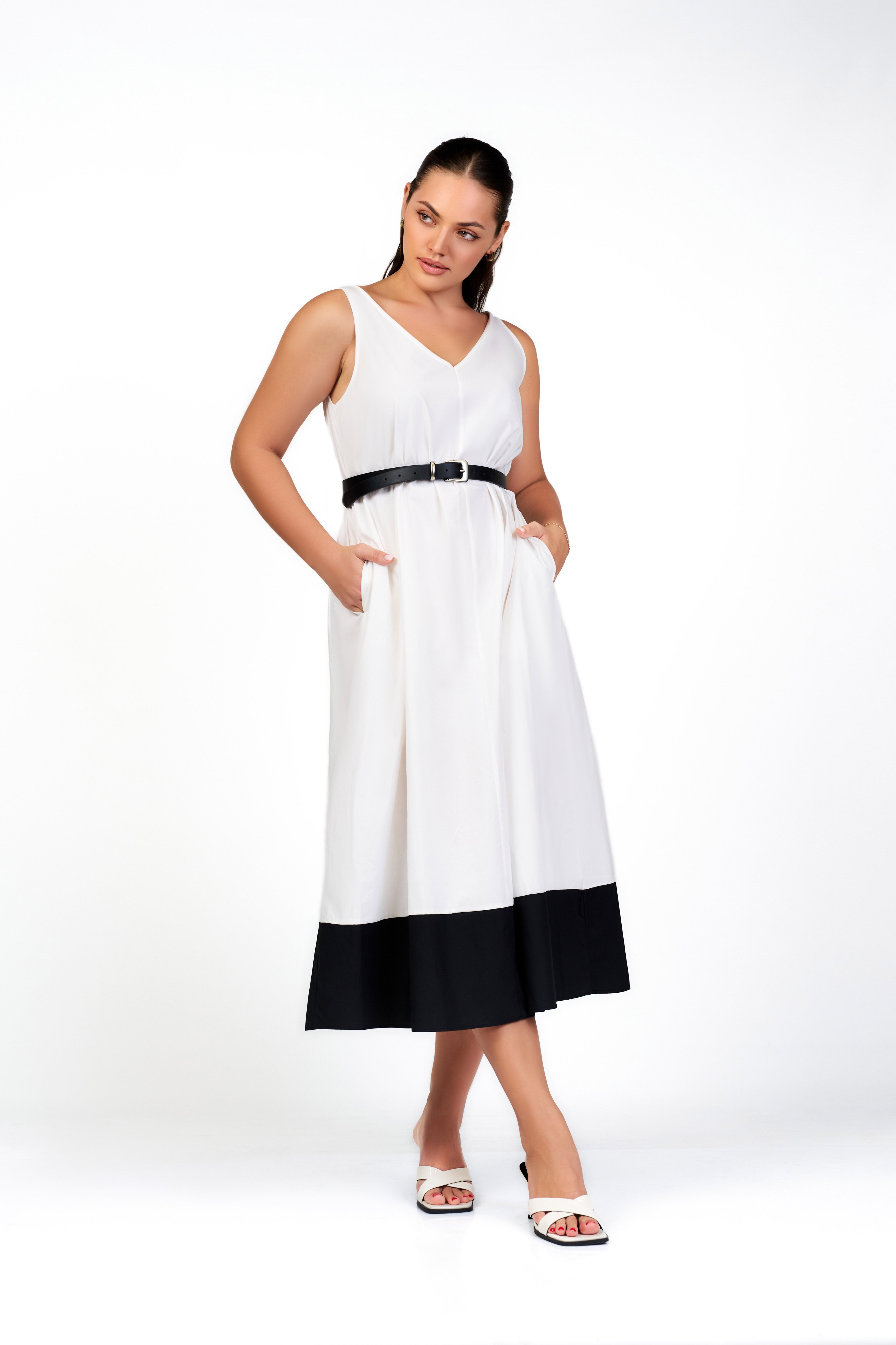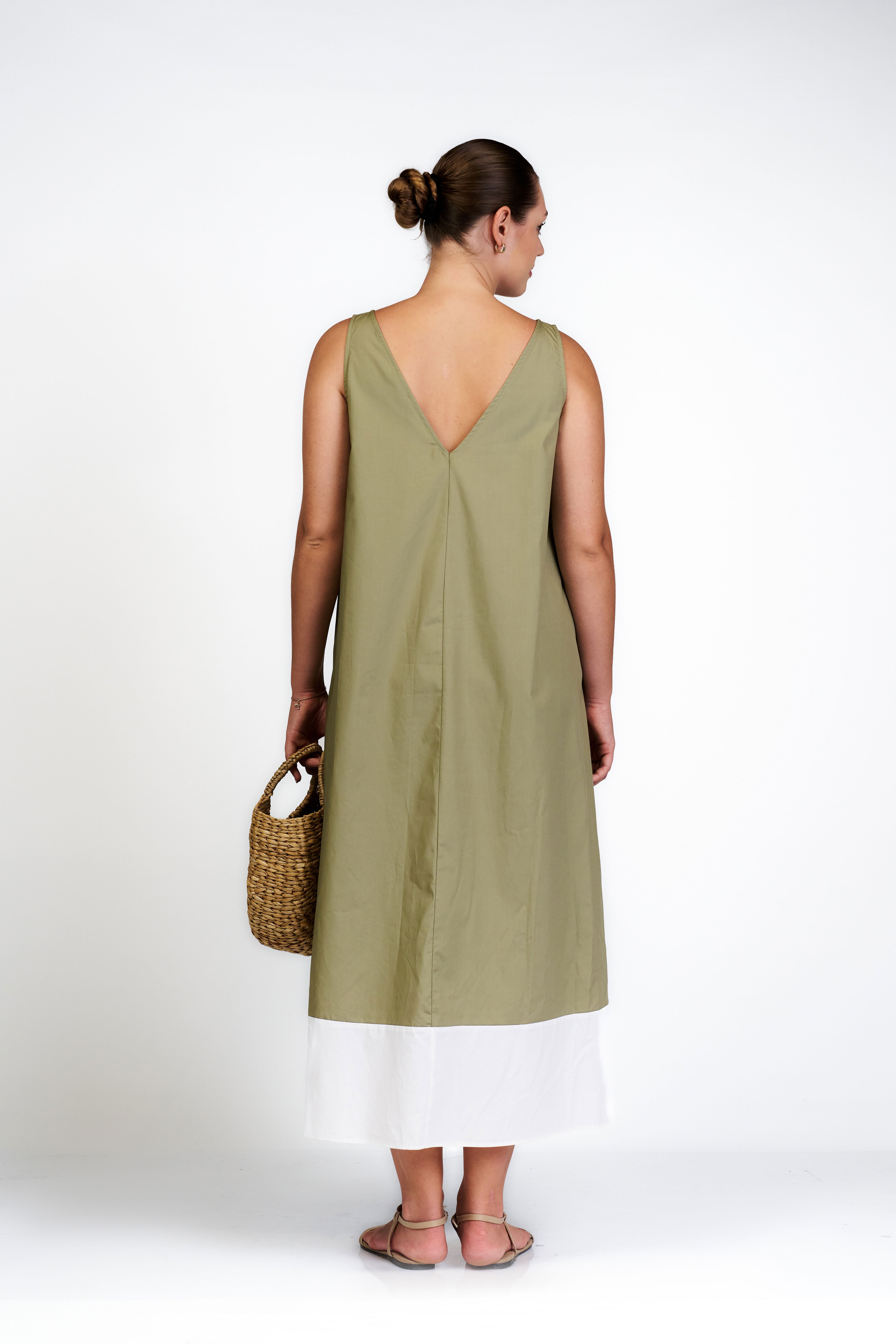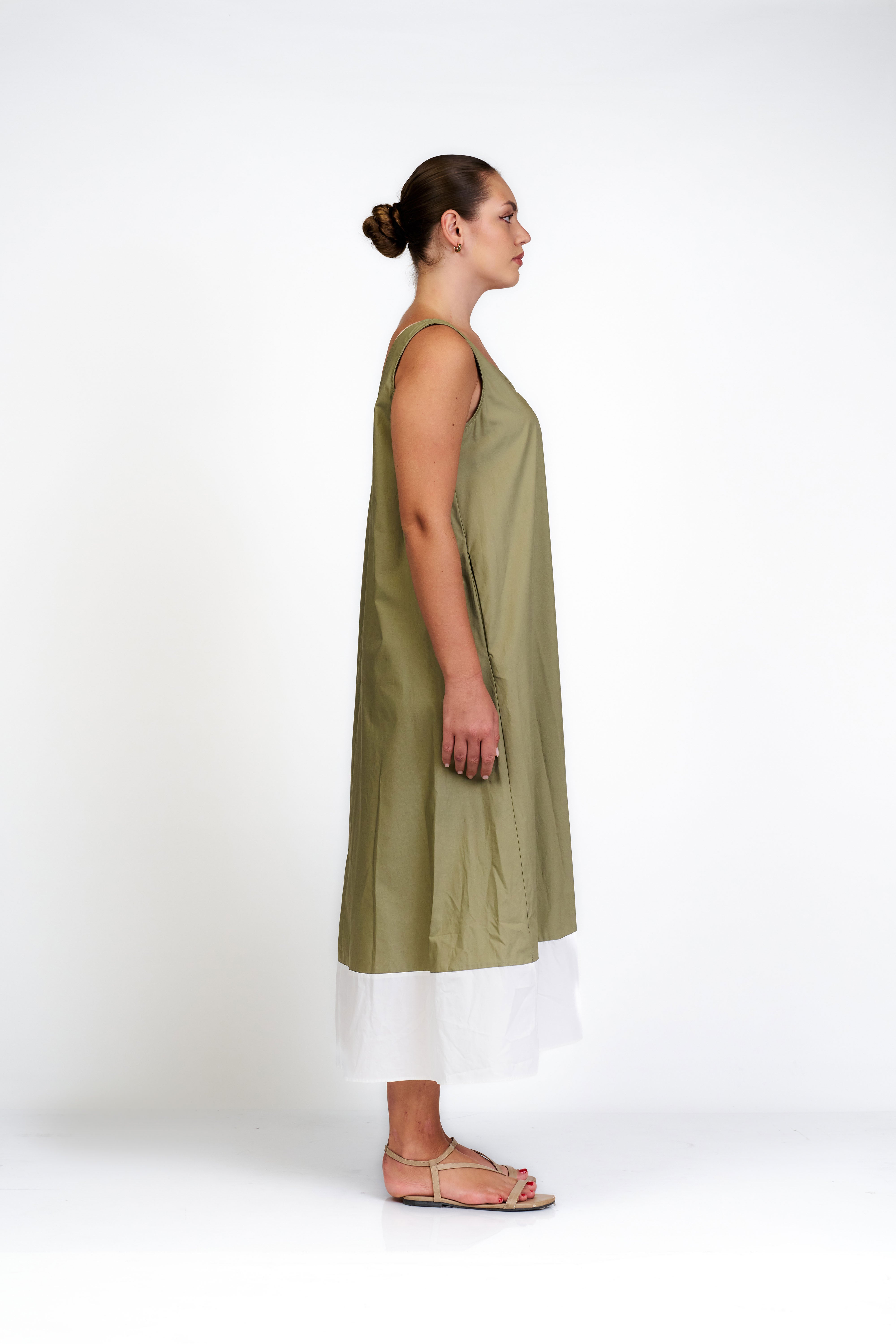This piece is the epitome of refined, romantic polish. It features a sophisticated flowy midi silhouette that moves gracefully with the wearer. The deep olive body is grounded by a bold, crisp white contrast hem, offering a contemporary twist on a classic A-line shape. Designed with a clean V-neckline and sleeveless cut, it transitions seamlessly from a professional "fashion-first daywear" look to an elegant "versatile day-to-day"