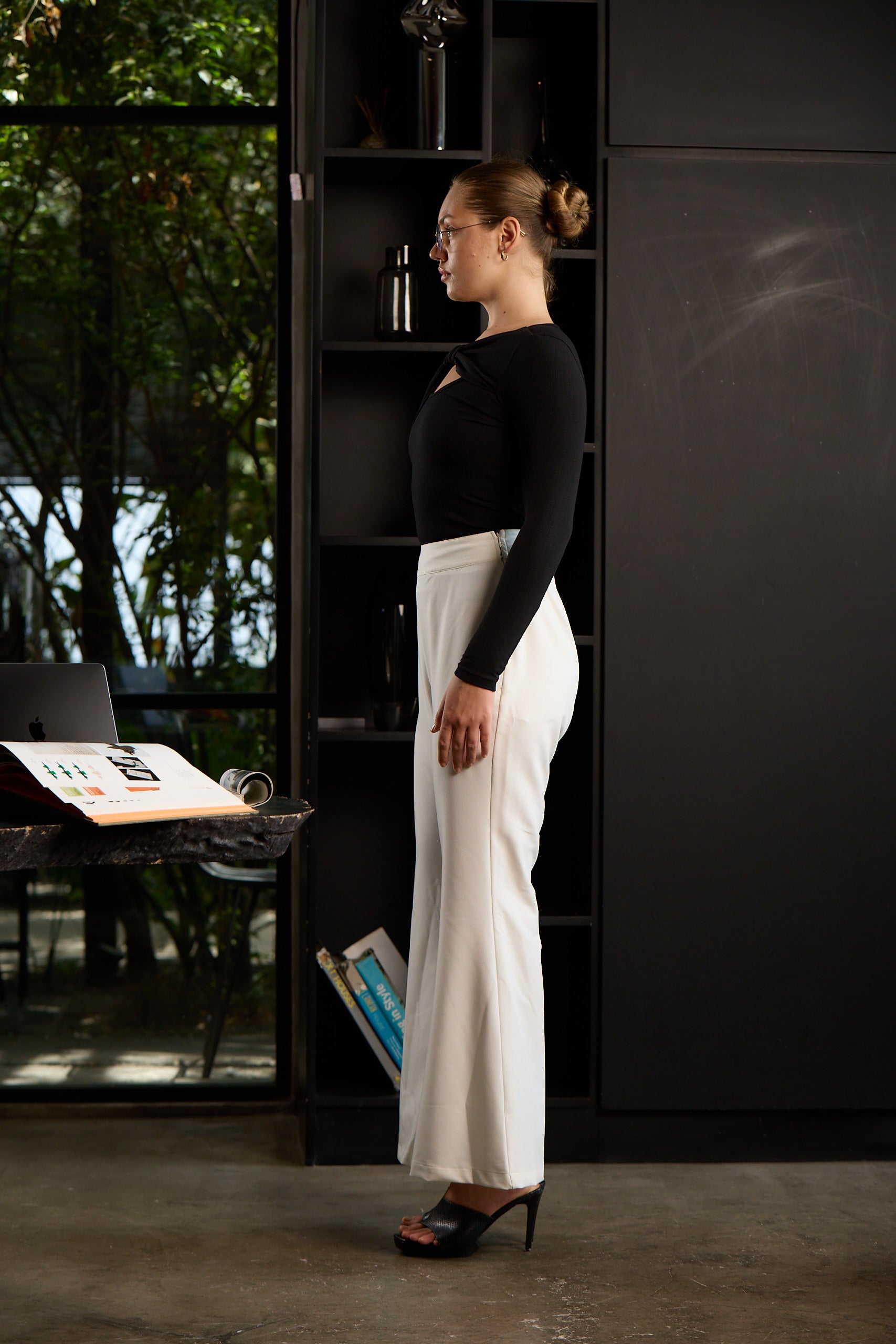 Embrace a bold and elegant silhouette with these striking flared trousers. Designed with a sophisticated high waist, they provide a flattering fit through the hips and thighs before dramatically widening into a full bell-bottom leg. The crisp white fabric and clean tailoring make them versatile for both professional and upscale casual settings. The structured waist ensures a smooth line when paired with fitted or cropped tops, perfectly completing a sharp, modern ensemble.