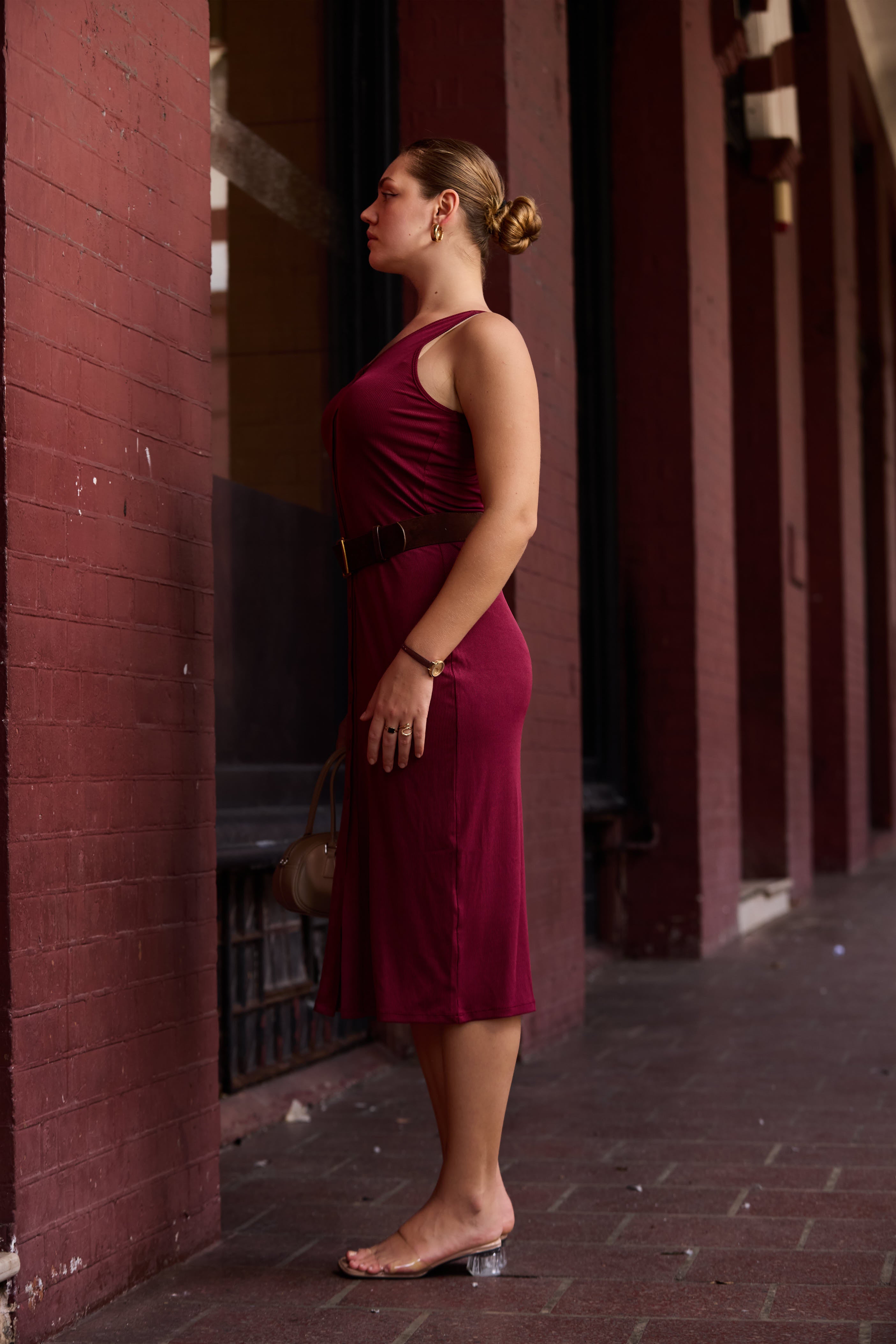 A figure-hugging ribbed midi dress designed to enhance the natural silhouette with comfort and ease. The soft stretch fabric contours the body, while the button-down front and subtle slit add movement and detail. Finished in a rich crimson tone, this piece blends simplicity with bold femininity, making it perfect for effortless day-to-evening styling.