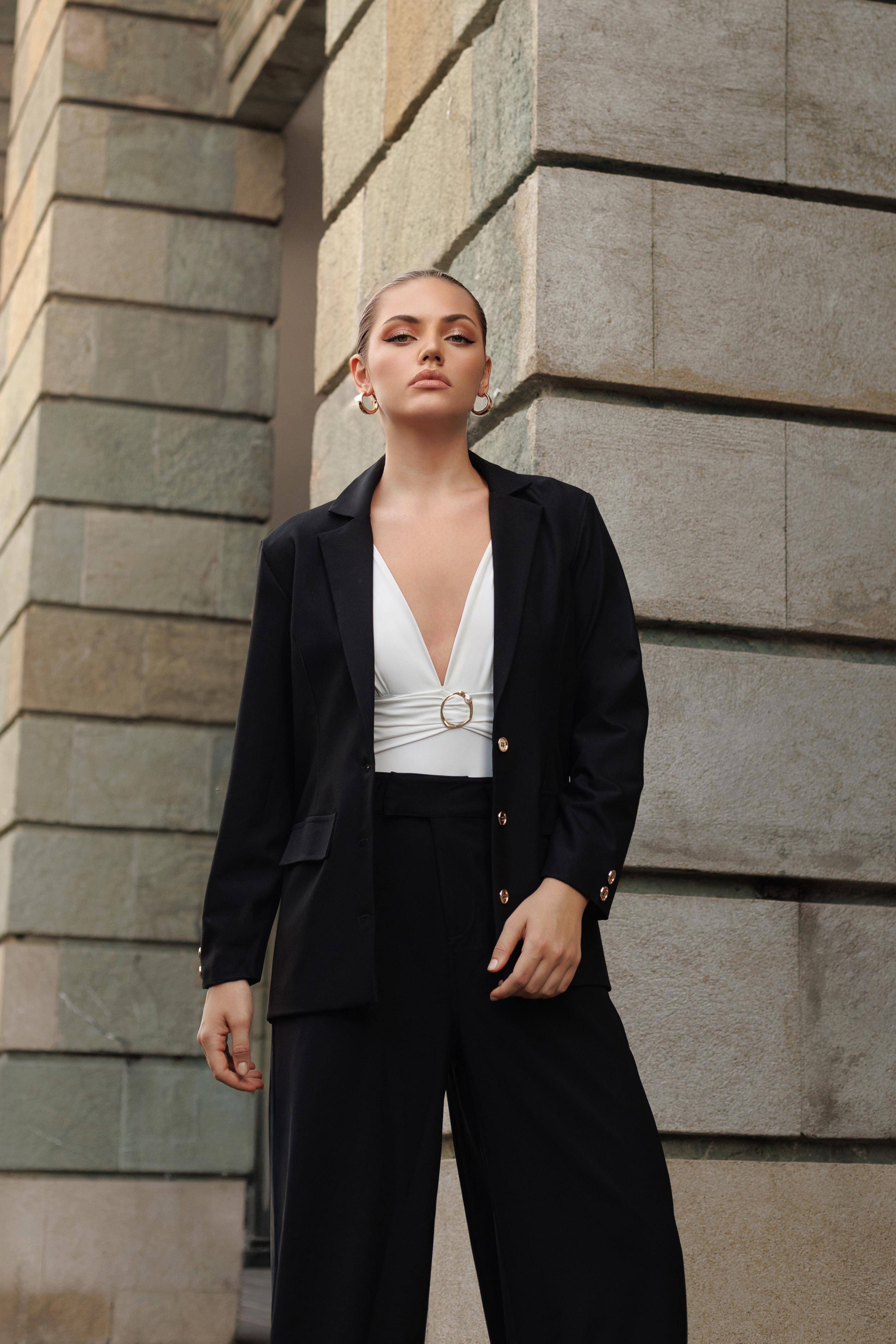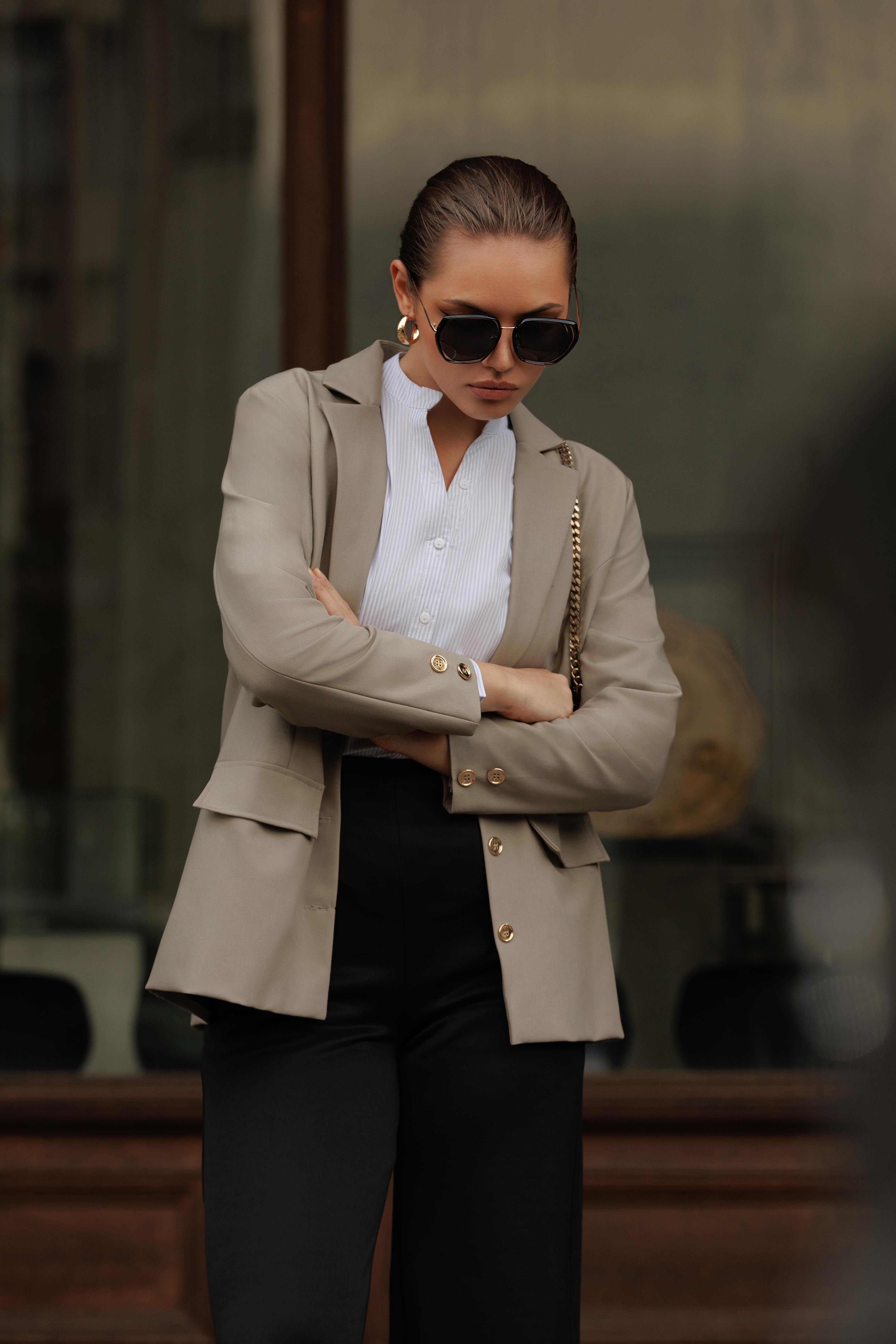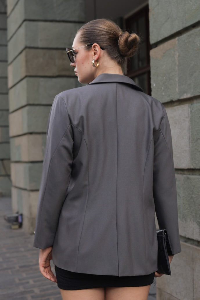 This oversized blazer is presented in a sophisticated, muted colour that gives it an air of relaxed professionalism. The jacket boasts a contemporary, slightly boxy silhouette, draping effortlessly over the wearer's frame for a chic, modern feel. Its classic lapel and traditional flap pockets anchor the design, while the fabric appears lightweight and smooth, making it an ideal piece for stylish layering. The blazer's generous cut allows it to be casually worn open, perfectly balancing the more structured formality of its design with the youthful, sleek black outfit underneath.