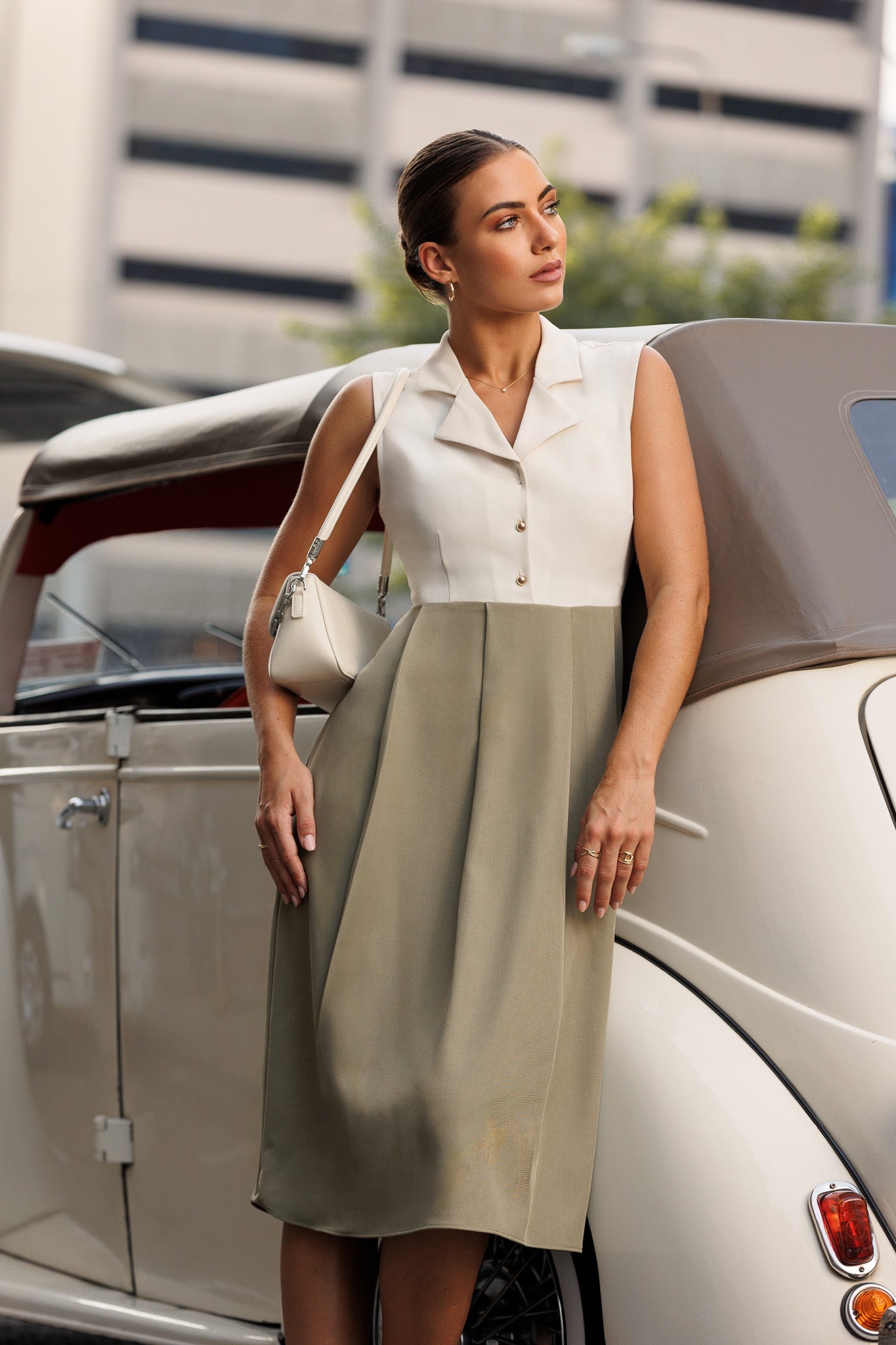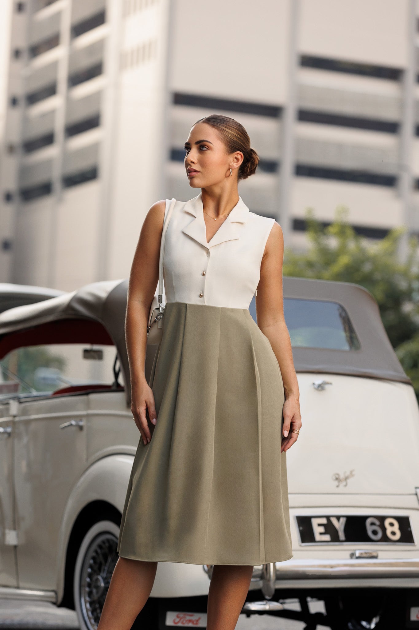 This is a chic and sophisticated two-toned dress. The top is a sleeveless, cream-colored bodice with a classic shirt collar and a partial button placket, fastened with what appear to be delicate gold buttons. The bottom half is a pleated, A-line skirt in a muted khaki and brown shades, which falls to a midi length. The dress's clean lines and elegant silhouette, paired with the simple, classic accessories and a neat hairstyle, perfectly capture a timeless "old money" aesthetic.