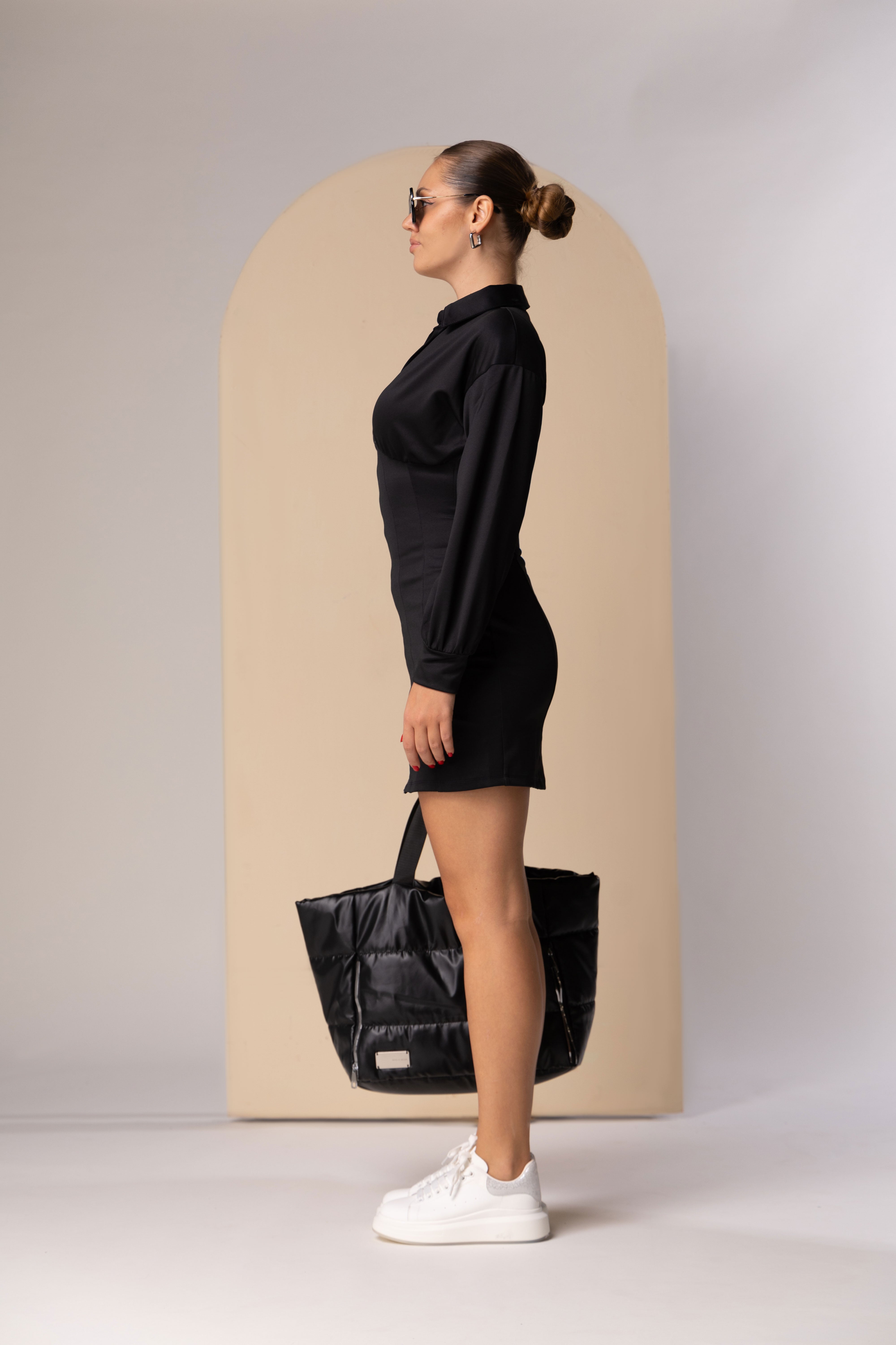 The look centers on a structured black blazer, featuring clean lines and a modern, buttonless open-front design that suggests a fast-paced, "on-the-go" professional lifestyle. This formal outer layer is high-contrast paired with a form-fitting technical knit mini skirt and a matching bandeau-style base layer, which together provide the streamlined efficiency of activewear.