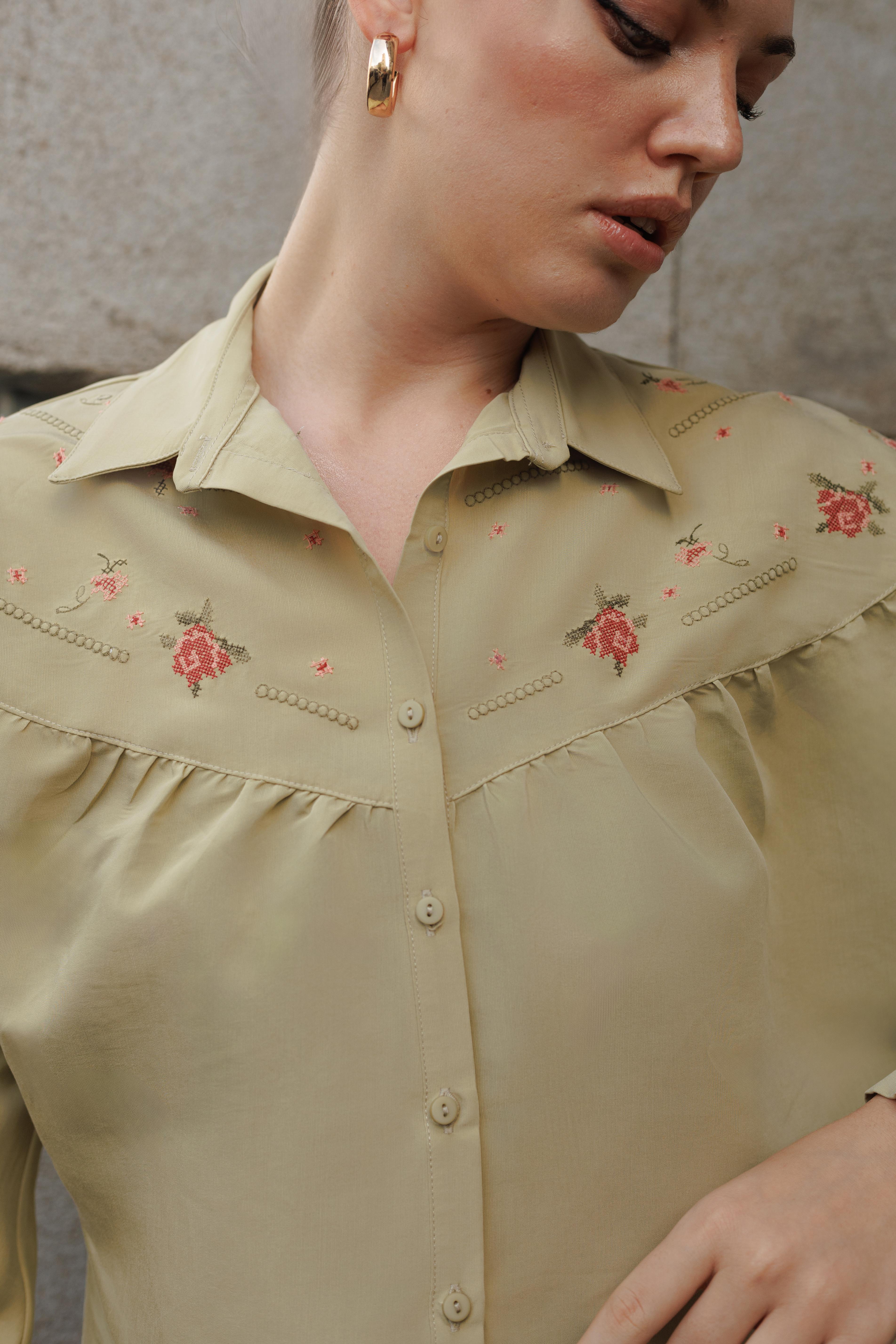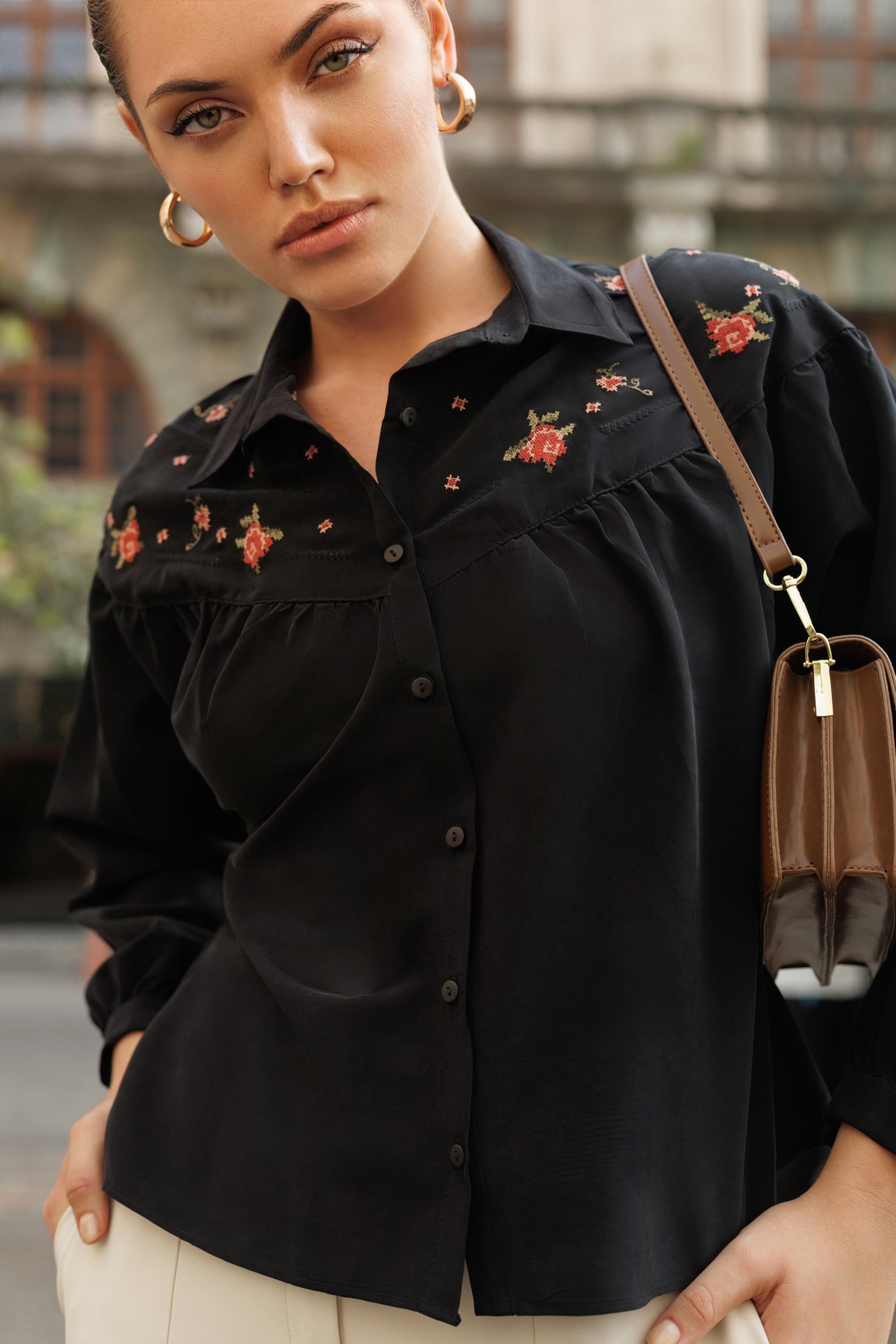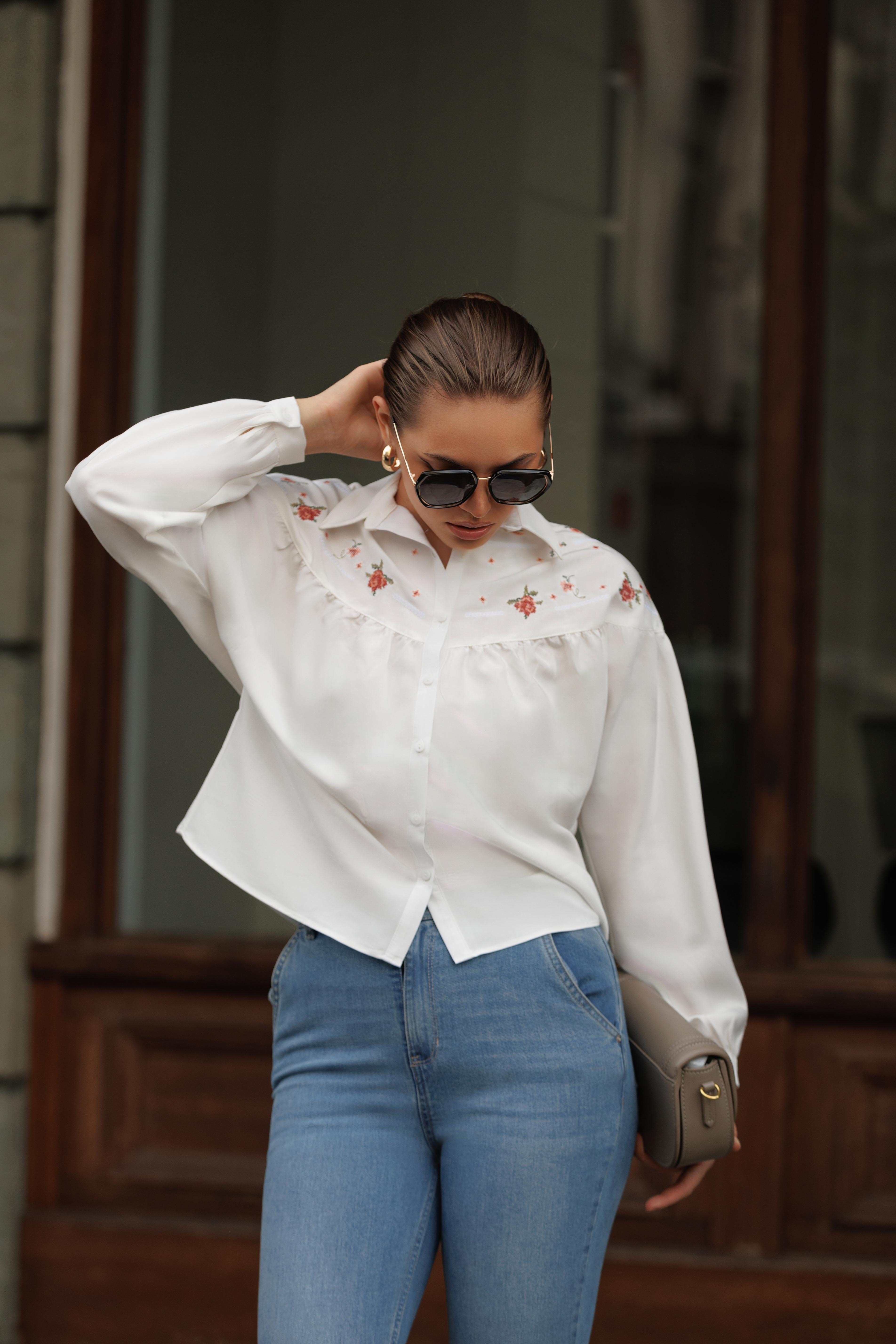 The most distinctive feature is the delicate floral embroidery across the yoke and collar area, featuring small pink and green accents that add a charming, romantic detail. It has a classic button-down front with small, tonal buttons running up to a standard pointed collar.