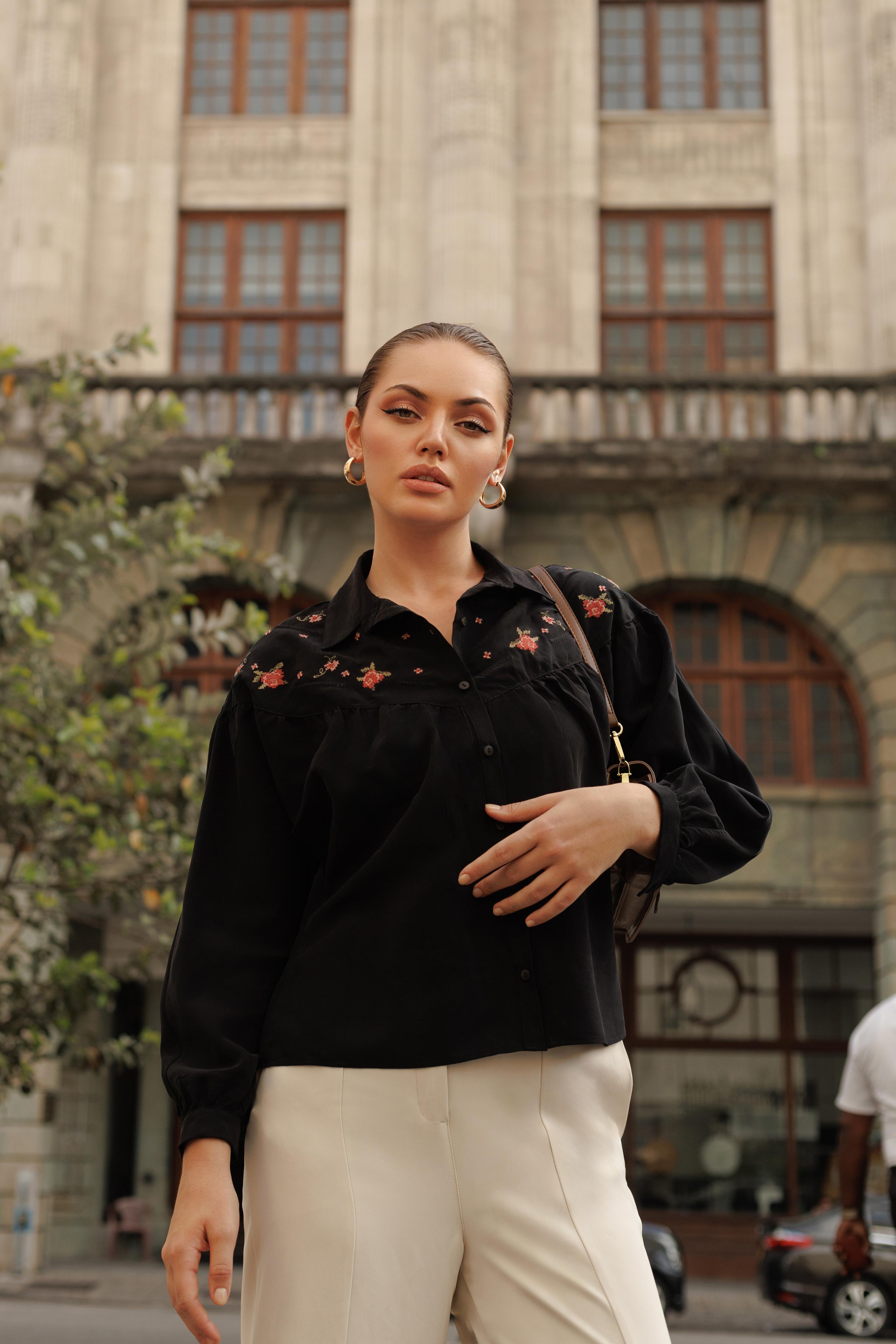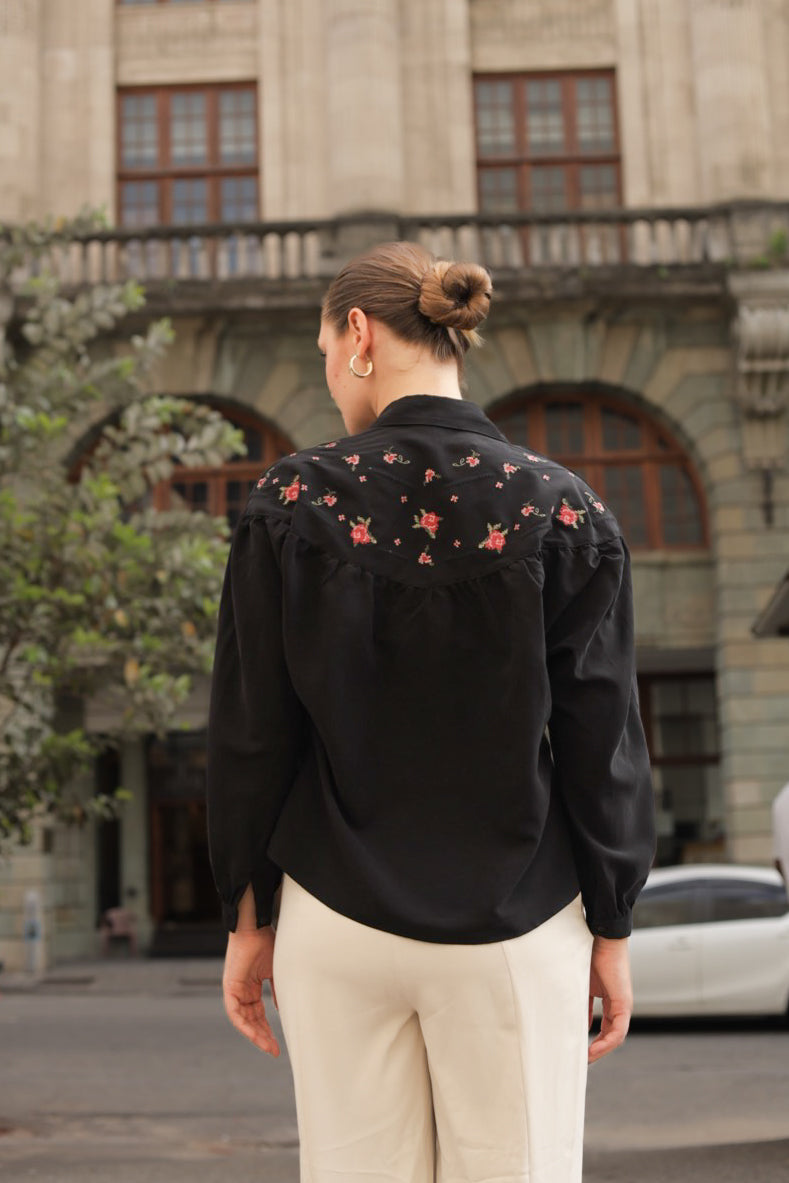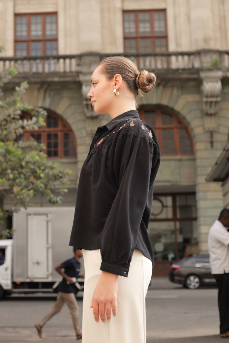 The most distinctive feature is the delicate floral embroidery across the yoke and collar area, featuring small pink and green accents that add a charming, romantic detail. It has a classic button-down front with small, tonal buttons running up to a standard pointed collar.