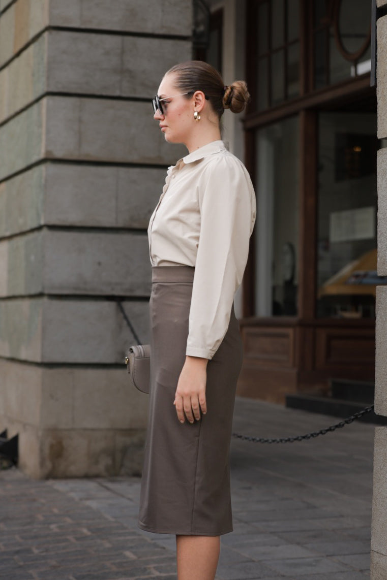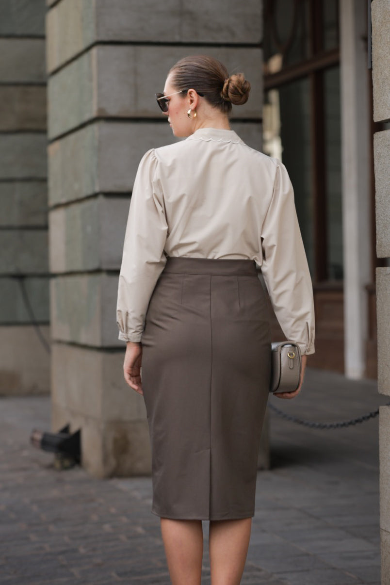 This is an elegant, tailored blouse that combines timeless sophistication with delicate detailing. It features a classic shirt collar and full-length sleeves with subtle gathers at the shoulder for a softly structured look. The front placket is highlighted with scalloped edge detailing and matching buttons, adding a refined feminine touch. Expertly crafted for a flattering fit, this blouse pairs effortlessly with both formal and smart-casual outfits. Made from a smooth, lightweight woven fabric, it ensures comfort and a polished finish throughout the day, perfect for workwear or chic everyday styling