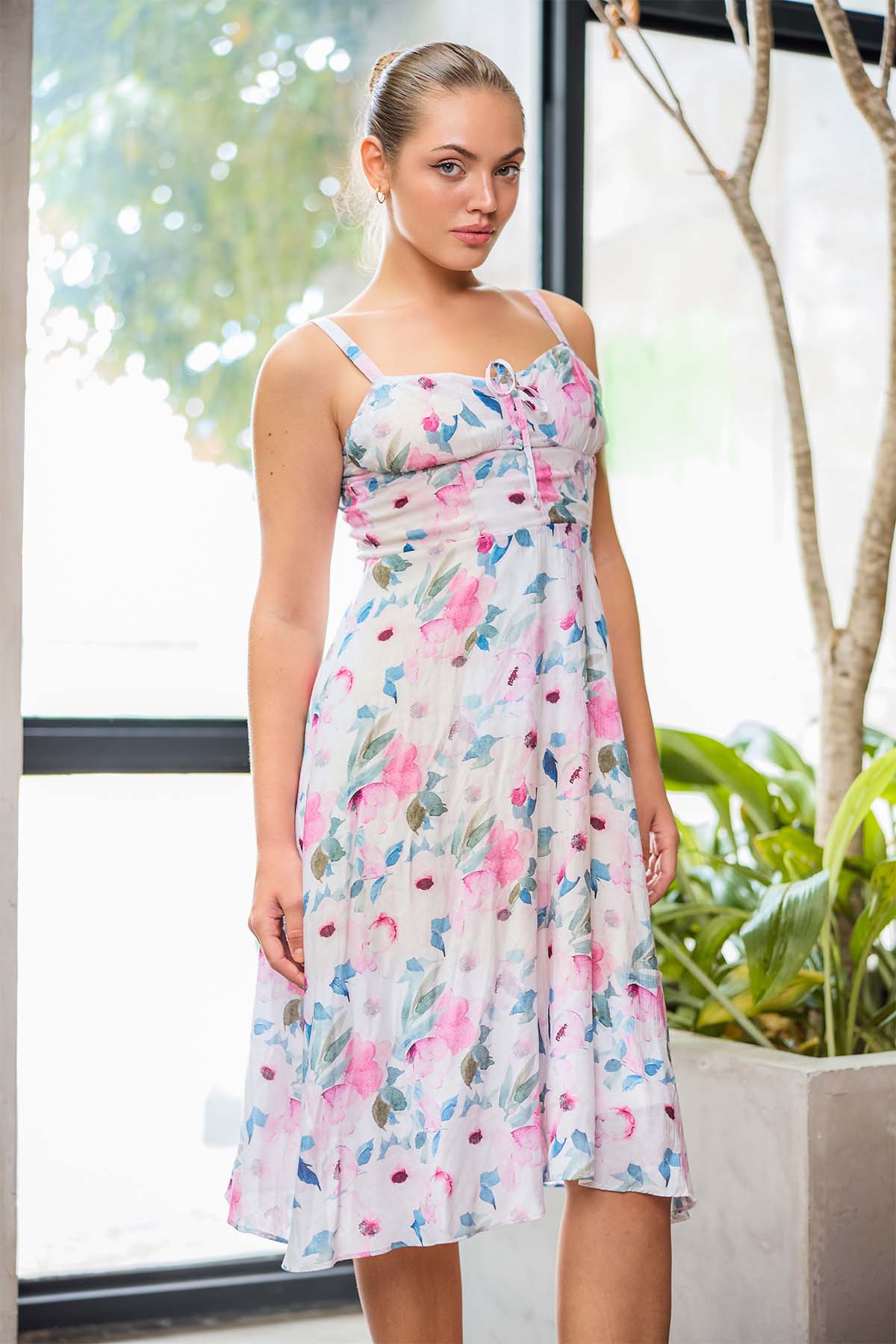 Embrace effortless elegance in this floral printed midi dress, designed with a flattering corset detail that cinches the waist for a defined silhouette. The delicate straps and soft floral pattern add a romantic touch, while the midi length ensures a graceful, everyday wearability. Perfect for casual occasions or a weekend getaway, this dress combines comfort and style in one beautiful piece.