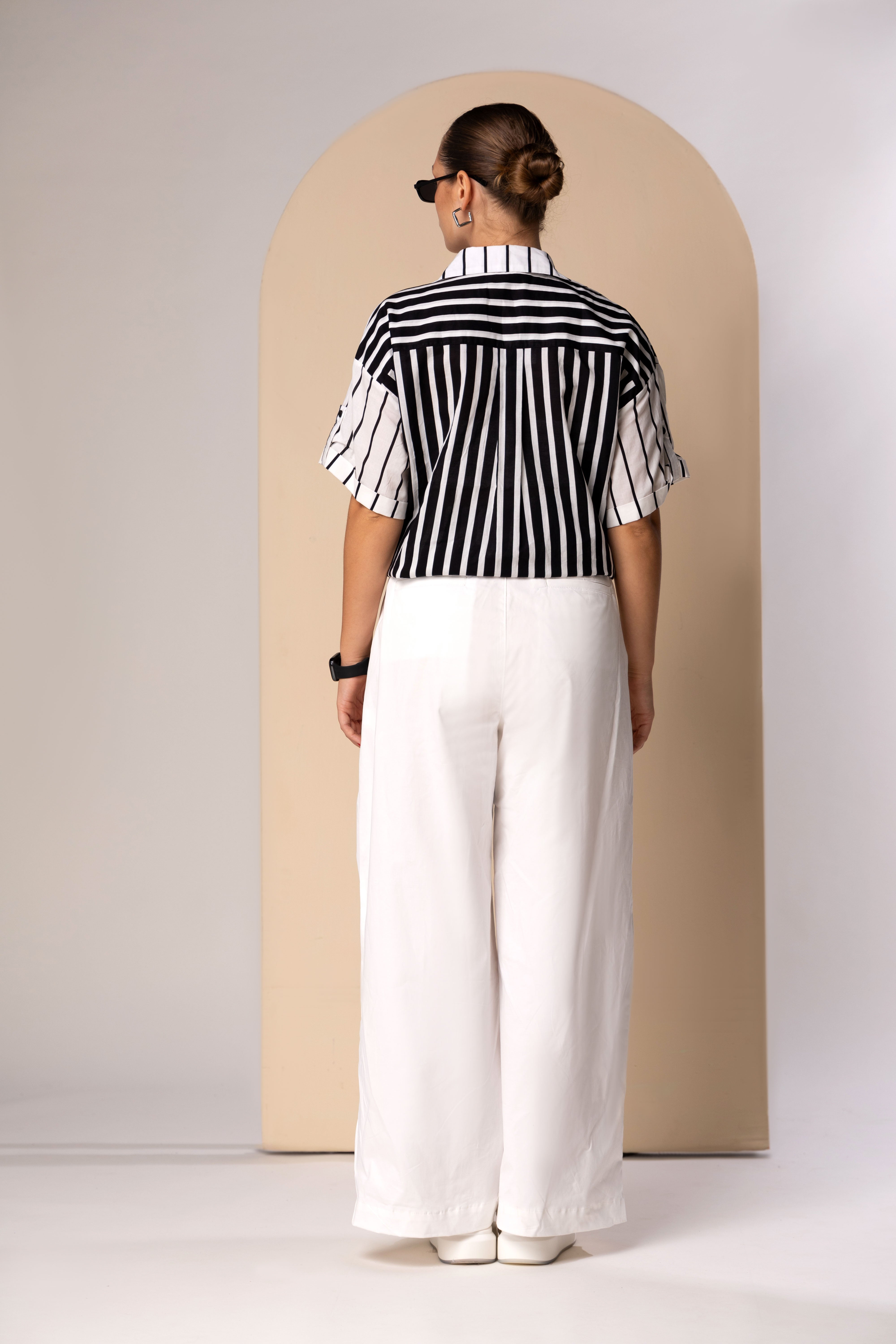 By styling the top with an intentional front-knot over a structured, white-knit mini skirt and matching bandeau, the outfit achieves a balanced play between volume and form-fitting tailoring. The use of traditional pinstripes—a staple of formal shirting—grounds the relaxed, drop-shoulder silhouette in a professional context, making it a refined alternative for business-casual settings. This narrative is further elevated by amber-tinted rectangular frames and sleek grooming, creating a polished, "Jetset-Chic" uniform designed for the modern professional who values lightweight comfort and a high-end, transitional wardrobe.