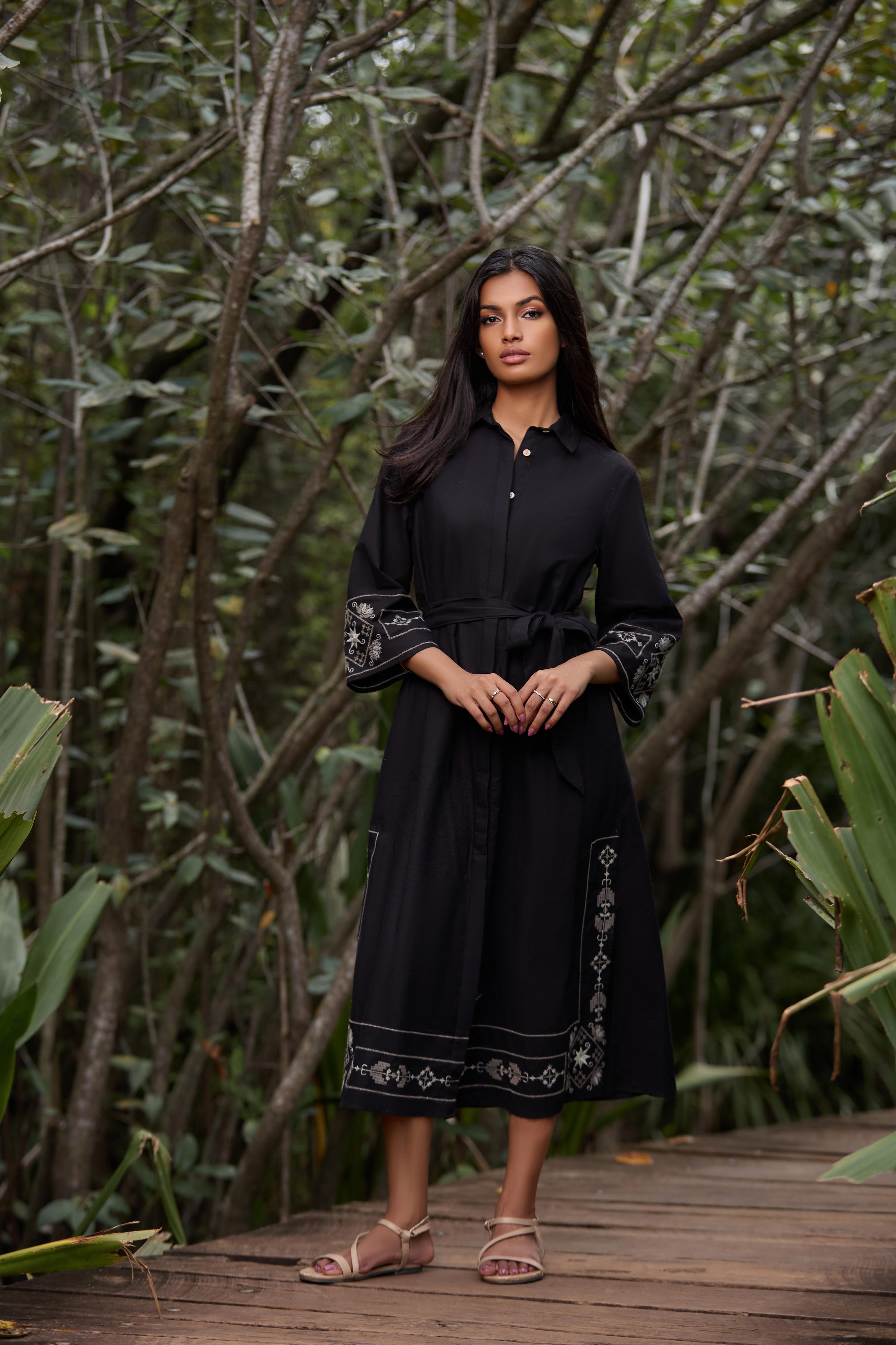 This elegant midi-length dress blends timeless style with refined craftsmanship. Designed with delicate embroidery detailing and a flattering button-down front, it offers effortless sophistication for any occasion. The waist tie detail accentuates your shape while ensuring a comfortable fit. Made from breathable fabric, its long sleeves and soft texture make it perfect for both casual and semi-formal settings, adding grace and comfort to your everyday wardrobe.